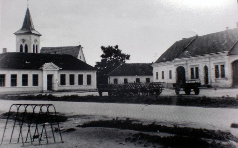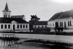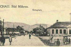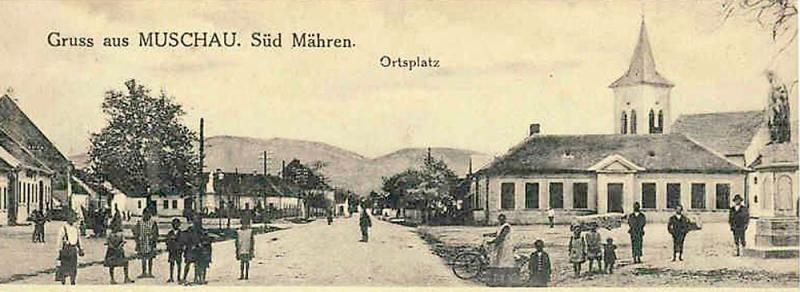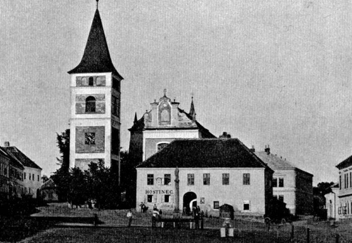 Historický pohled na náves s kostelem (část z historické pohlednice) počátek 20.století.