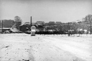 v pozadí za kaplí objekty bývalého vrchnostenského dvora přeměněného na likérku Hermann Löw, vpravo svah stoupající za řekou Ostravicí k zámku ve Frýdku