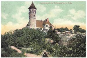 nároží hradu s nakoso vystupující bývalou věžící, vstupní severní křídlo (vlevo) a západní křídlo (vpravo) na počátku 20. století před demolicí