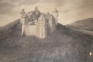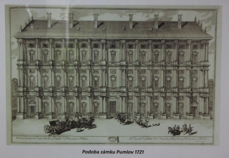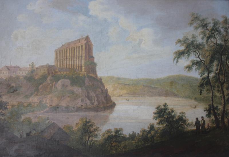 zámek od jihozápadu na pozdně barokní nástěnné malbě v 1. patře východního křídla