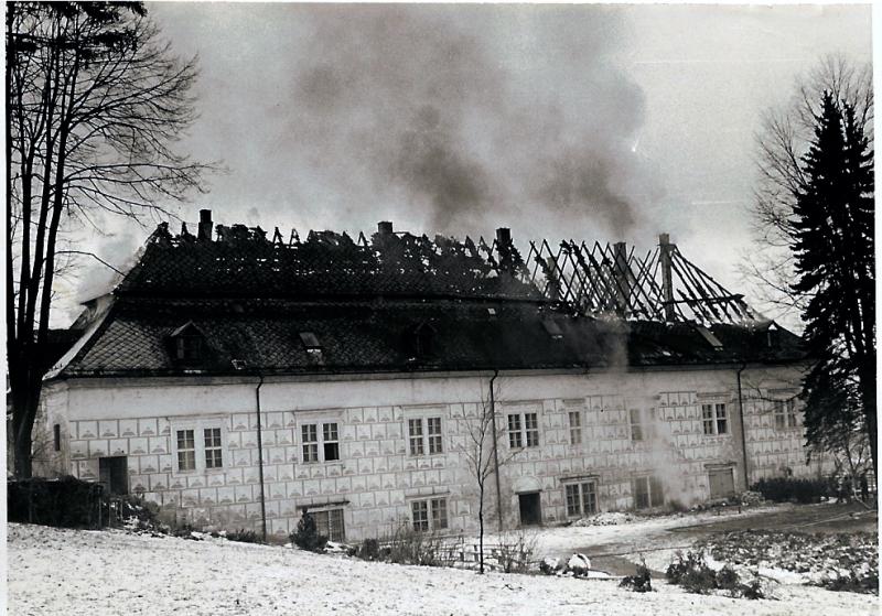 Scan fotografie z roku 1978, kdy došlo k tragickému požáru bysterského zámku (zapůjčeno)