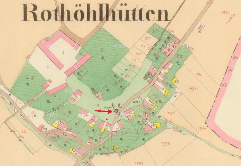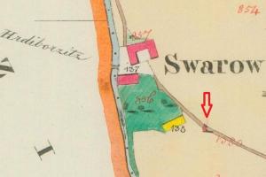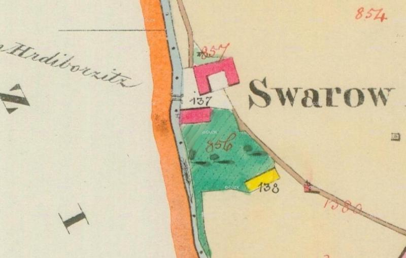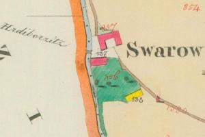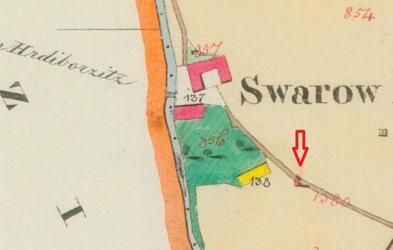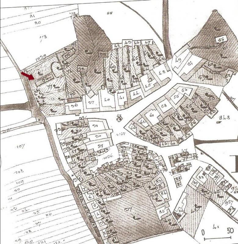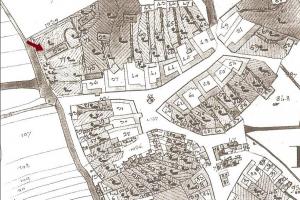 Indikační skica obce z r. 1833 (zámek označen šipkou)