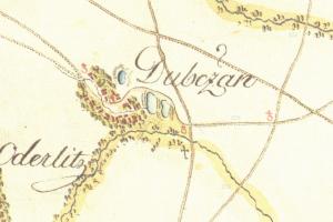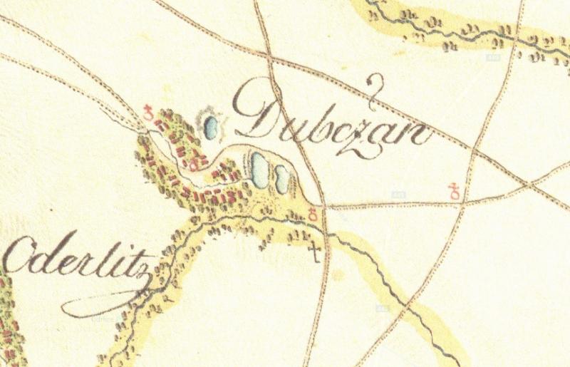 Dubčanech na staré mapě, ještě se třemi rybníky.