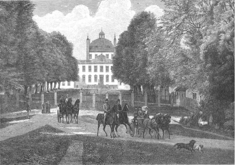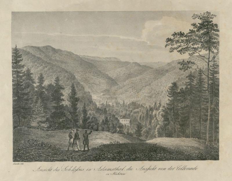 Pohled na zámek v Adamově od Kolonády, kolem roku 1833, autor Adolf Bedřich Kunike. Litografie