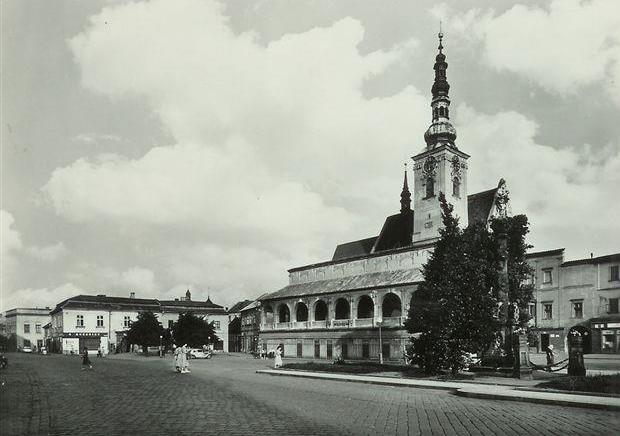 Historická fotografie - místo sochy mezi lipami vlevo. v pozadí původní domy, které nahradilo obchodní centrum v 70.let 20.stol.