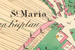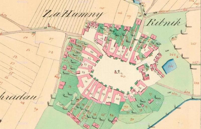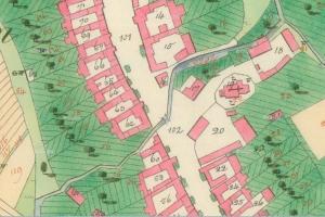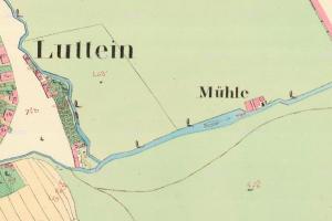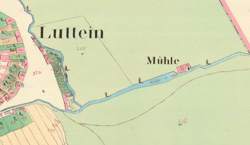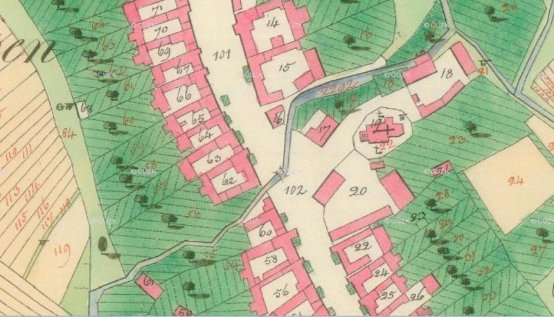 Mlýn ( u kostela č. p. 18) na císařském povinném otisku map stabilního katastru Moravy a Slezska z r. 1826.
