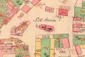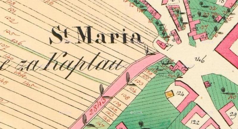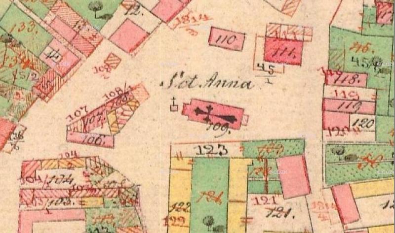 Původní starý kostel sv. Anny na Císařském povinném otisku stabilního katastru z r. 1824.