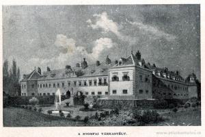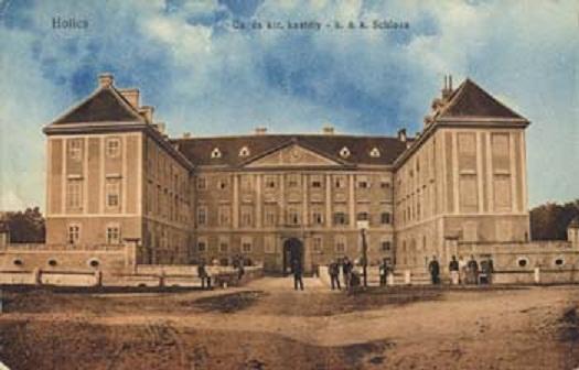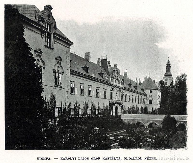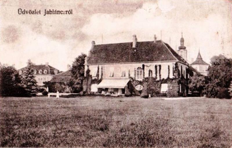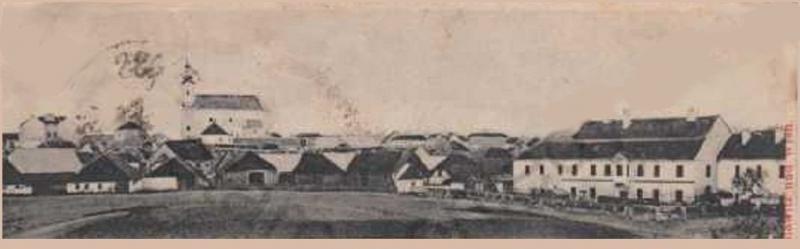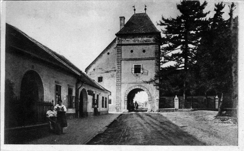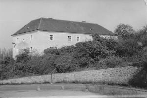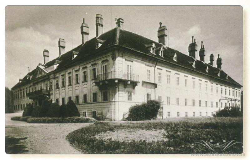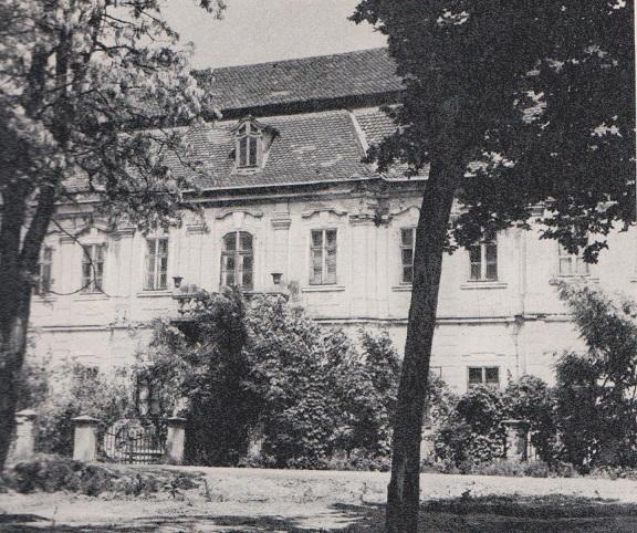 Pohled od západu ze zámecké zahrady (Dnes je na místě před zámkem fotbalové hřiště).
