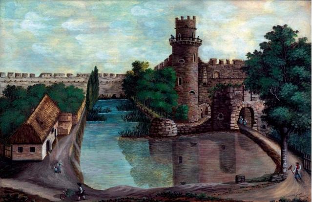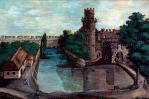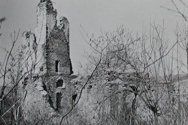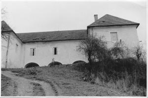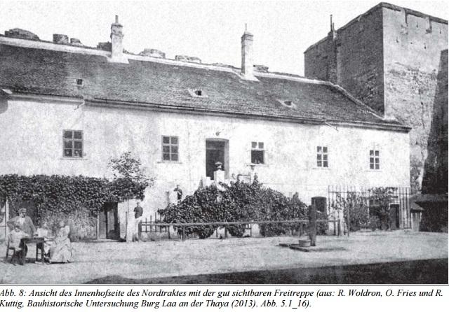 Pohled z jihozápadu kolem r. 1820-1830. (Z: R. Woldron, O. Fries a R. Kuttig, architektonické a historické vyšetřování Burg Laa an der Thaya (2013) Obrázek 5.9_03 ..)