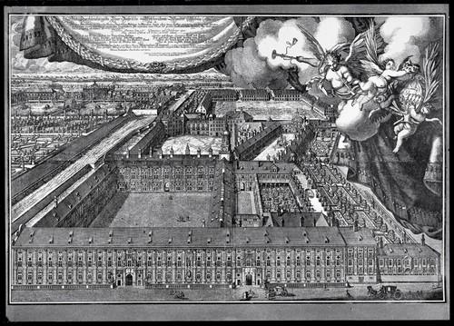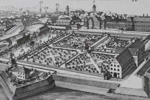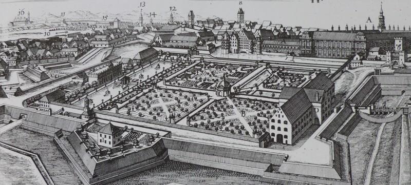 Pohled od severu od M. Weninga z r. 1701. V popředí zámecká zahrada a vpravo v pozadí Residenz