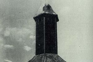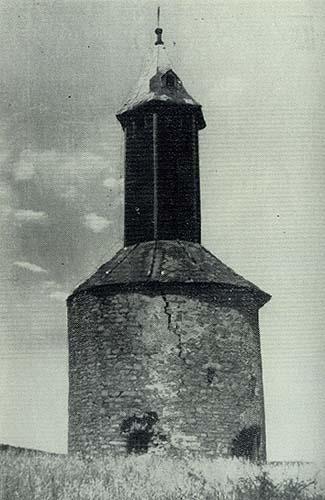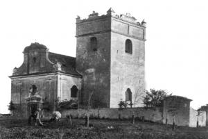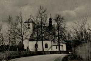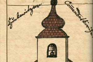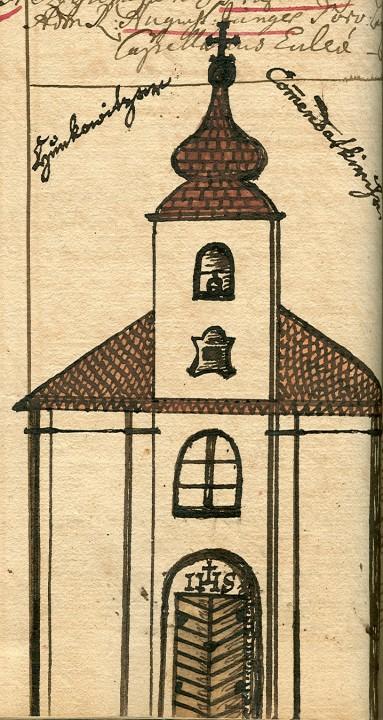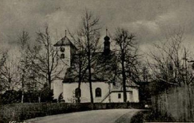 Kostel na kresbě, před úpravou střechy, z poloviny 19. století.