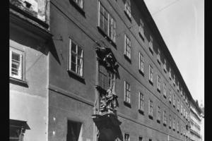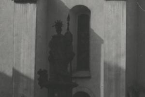 Detail fotografie z roku 1963, která dokládá přítomnost sochy sv. Floriána u kostela sv. Jošta
