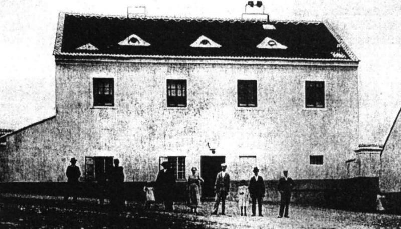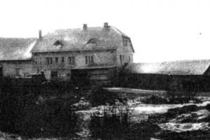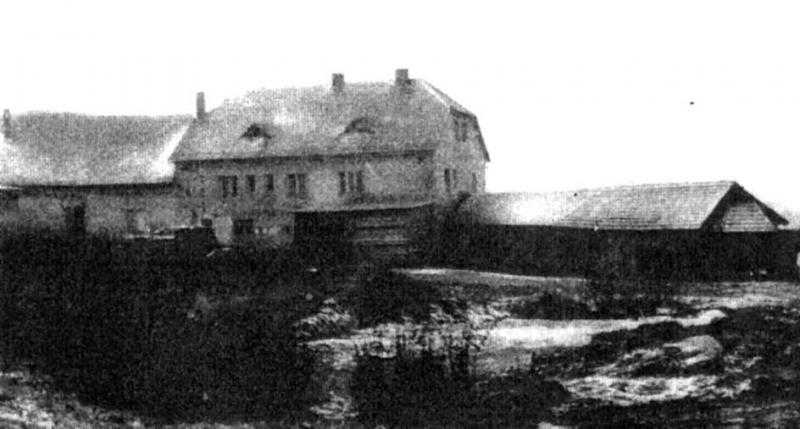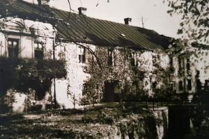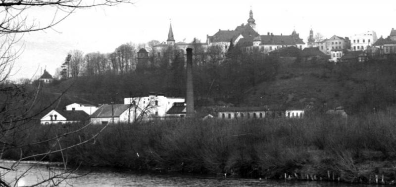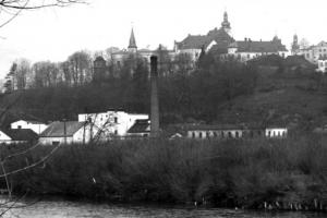 Historický pohled na dvojblok kancelářské budovy (bývalý pivovar) a tkalcovny (bývalý vodní mlýn). Přibližně v polovině 20. století