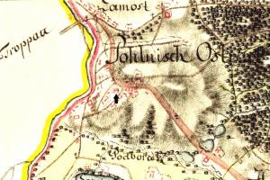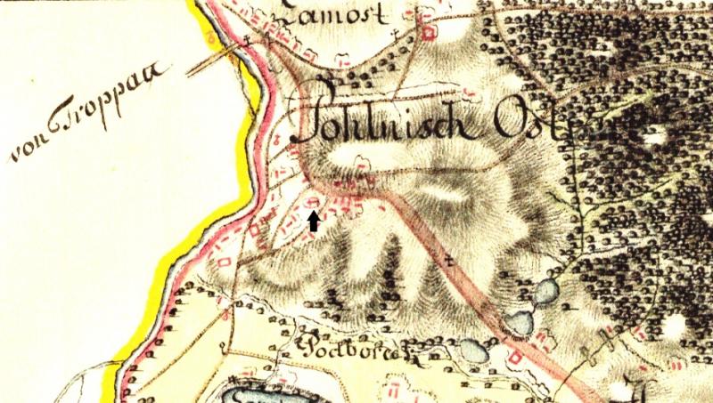 Slezská (Polská) Ostrava na mapě 1. vojenského mapování ze 60. let 18. století - kostel sv. Jiří označen šipkou