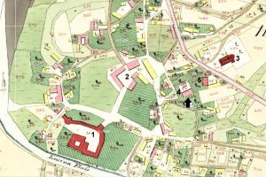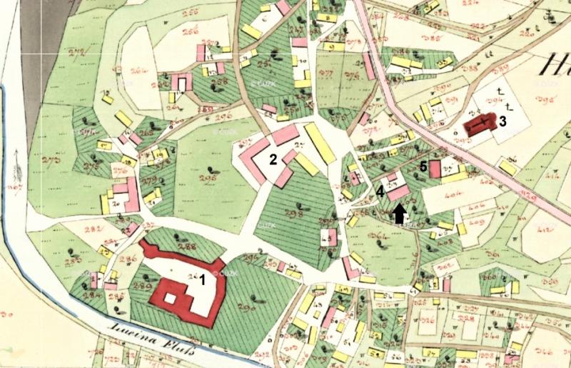 Legenda: 1 - Slezskoostravský hrad (zámek), 2 - vrchnostenský dvůr, 3 - kostel sv. Josefa, 4 - bývalý kostel sv. Jiří, 5 - fara