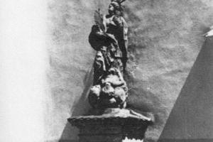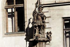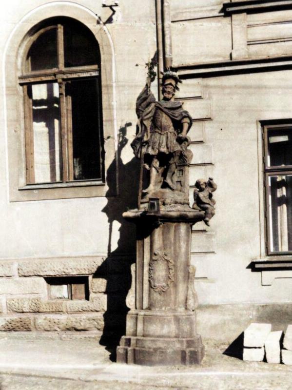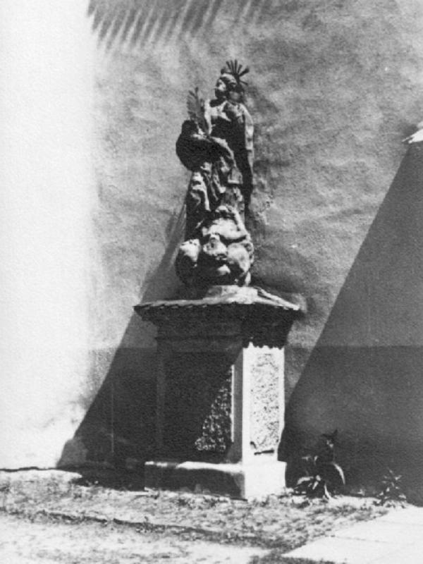 Socha sv. Floriána u kostela sv. Jošta v roce 1957 - všechny kovové atributy jsou na svém místě a stejně tak i kamenný andílek.