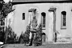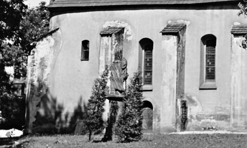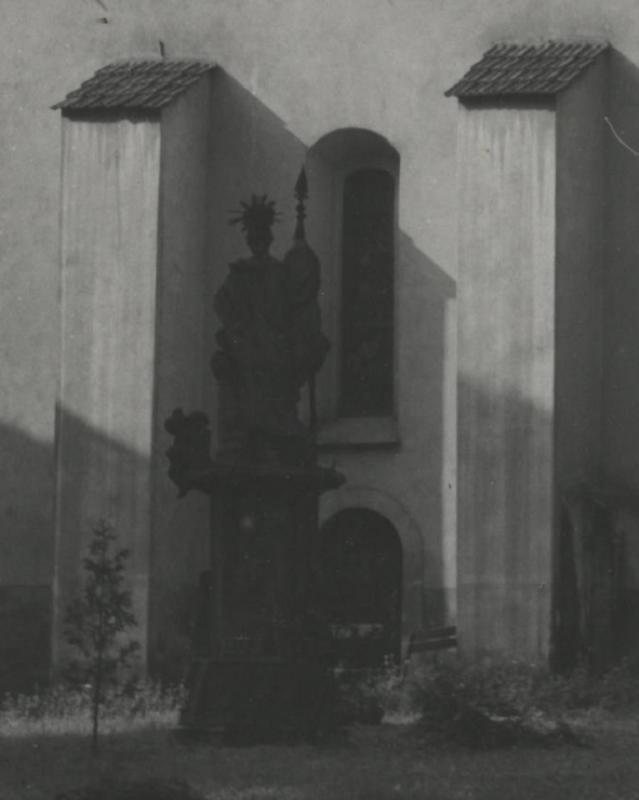 Fotografie dokládá jednak špatný stavební stav renesančního kostela už v 60. letech 20. století, tak hlavně, že ještě v této době měla socha jak všechny kovové atributy, tak i sošku andílka u nohou.