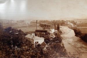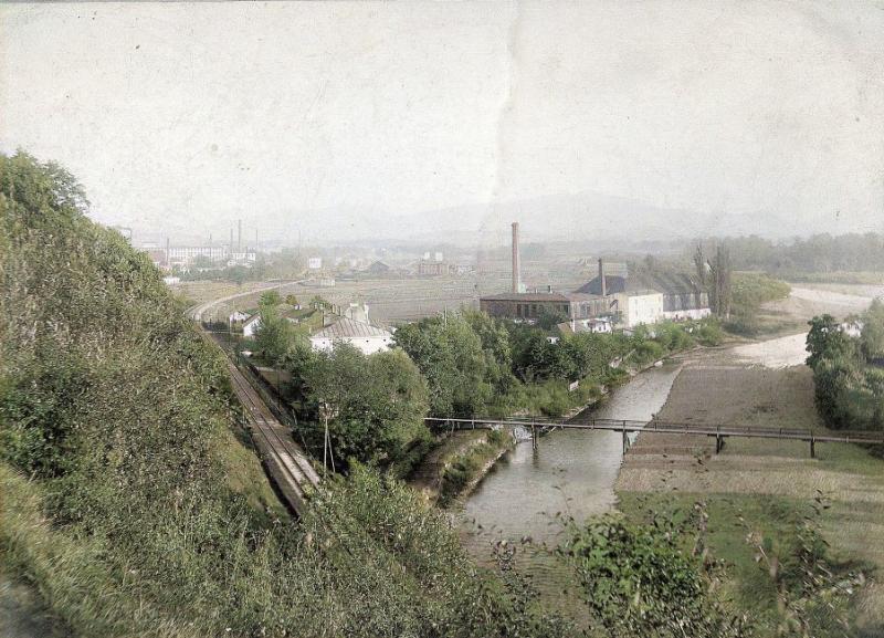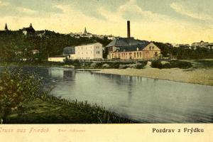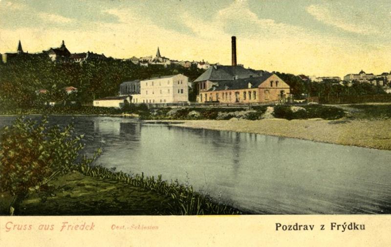 Pohled na areál a dolní část Frýdku kolem řeky z vyhlídky u frýdeckého zámku. Přelom 19. a 20. století