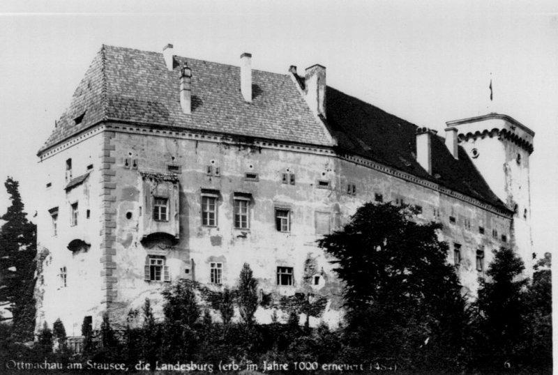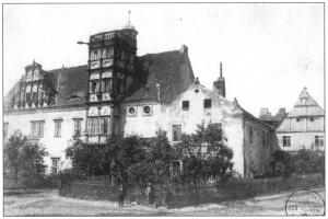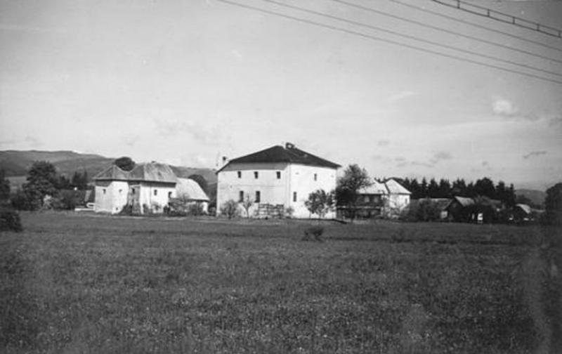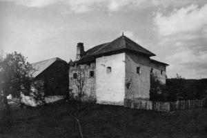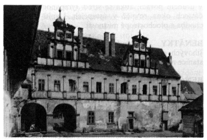 Hlavní průčelí mladší tvrze, v pozadí štít starší tvrze, na fotografii F. Vejrycha