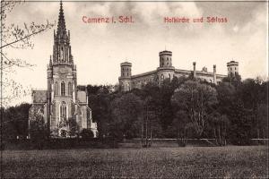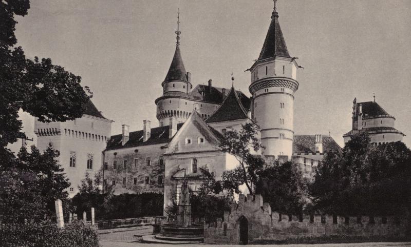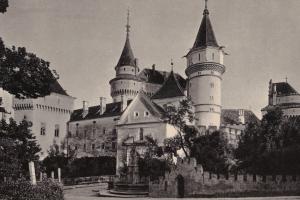 Dvorní kostel a zámek na pohlednici z počátku 20. stol.