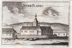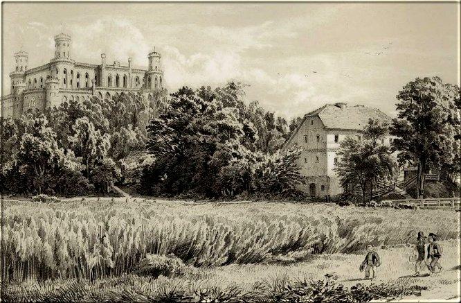 hrad, kostel a zámek v r. 1826 ještě s vodním příkopem