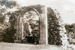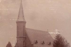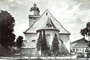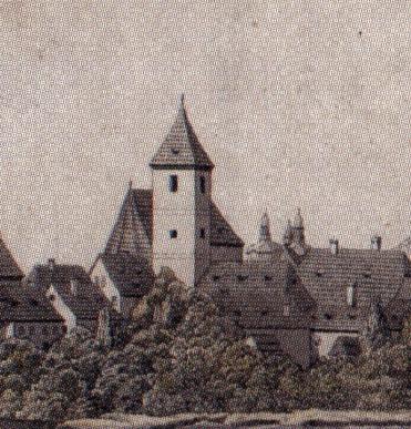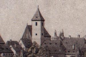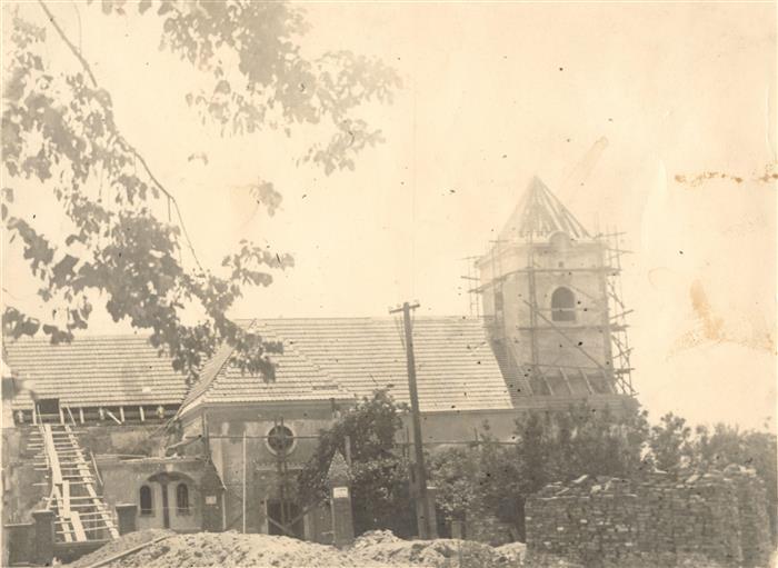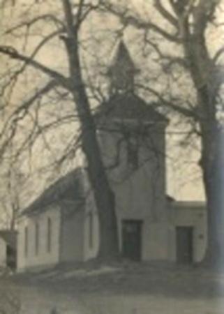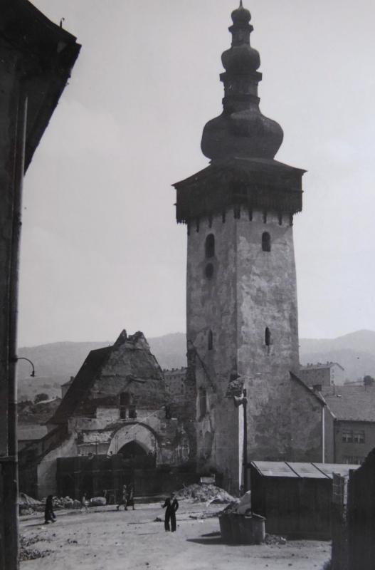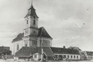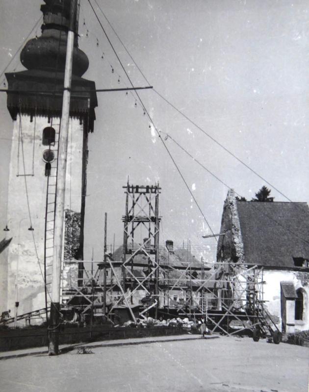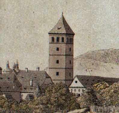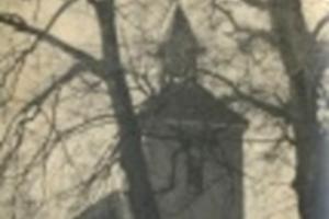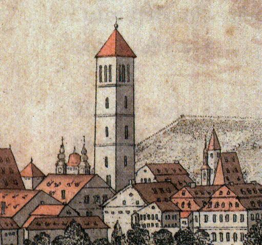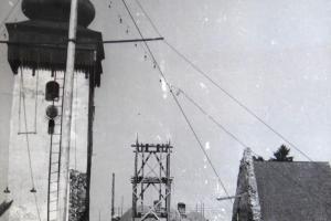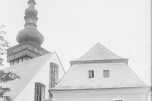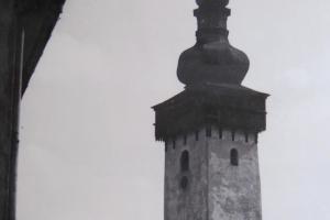 zvonice před odstraněním věžičky poškozené při kácení lip v r. 1981