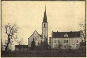 evangelický kostel a zámek na pohlednici ze začátku 20. stol.