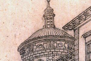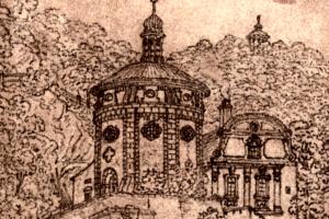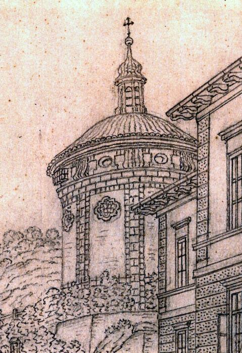 kaple v původním umístění s drobným letohrádkem po boku, Vincenc Morstadt, kresba tužkou, 1871