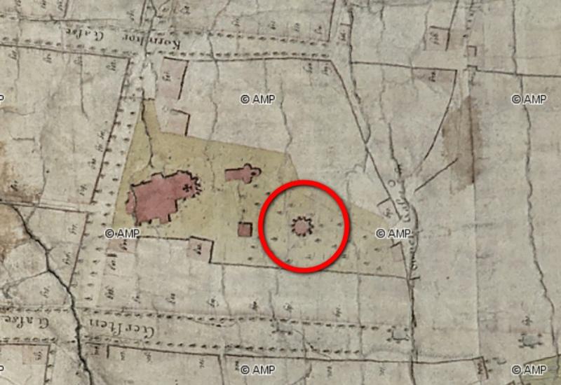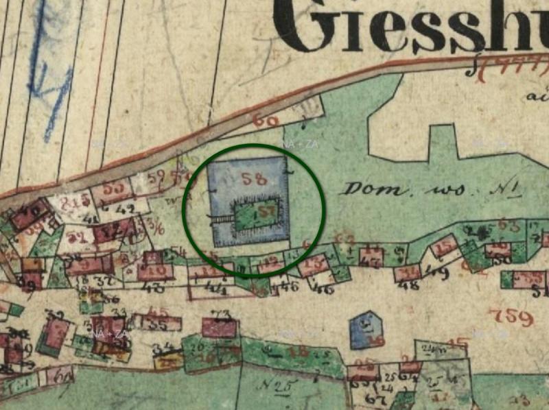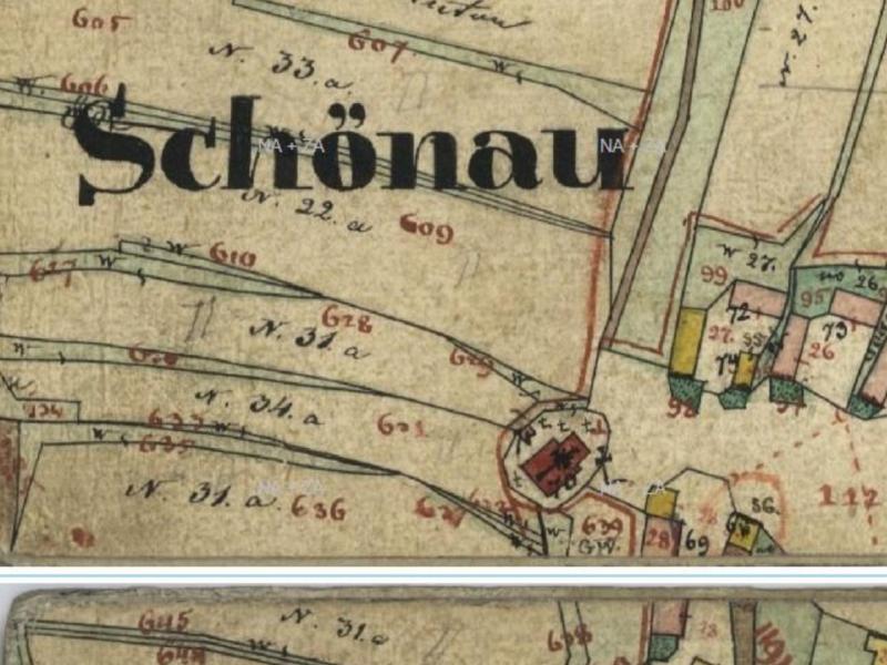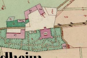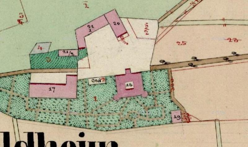 Zámek označen č. 18, kaple v rohu zámecké zahrady (č. 19), před zámkem pravděpodobně budovy pivovaru (č. 20 a 21)