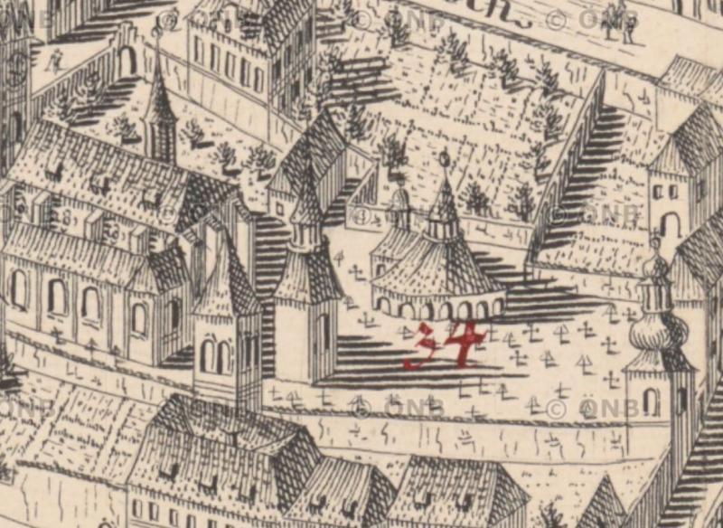 Detail kaple Božího Těla a Krve z takzvaného Vratislavského prospektu, dřevořez,