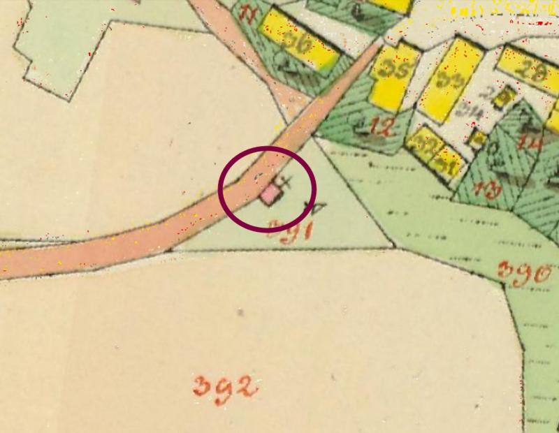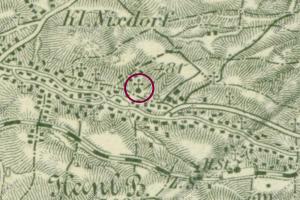 Mapa z roku 1885. Budova nad Vondračkou je dodnes existující, leč přestavěná usedlost Perucka