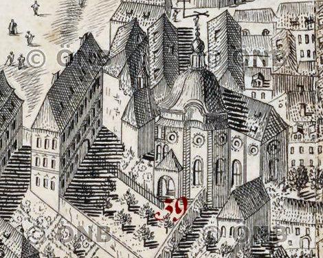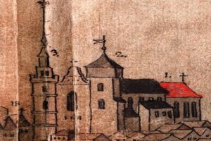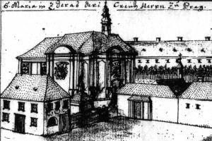 kostel s prelaturou (vlevo) na Huberově panoramatu Prahy