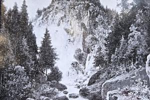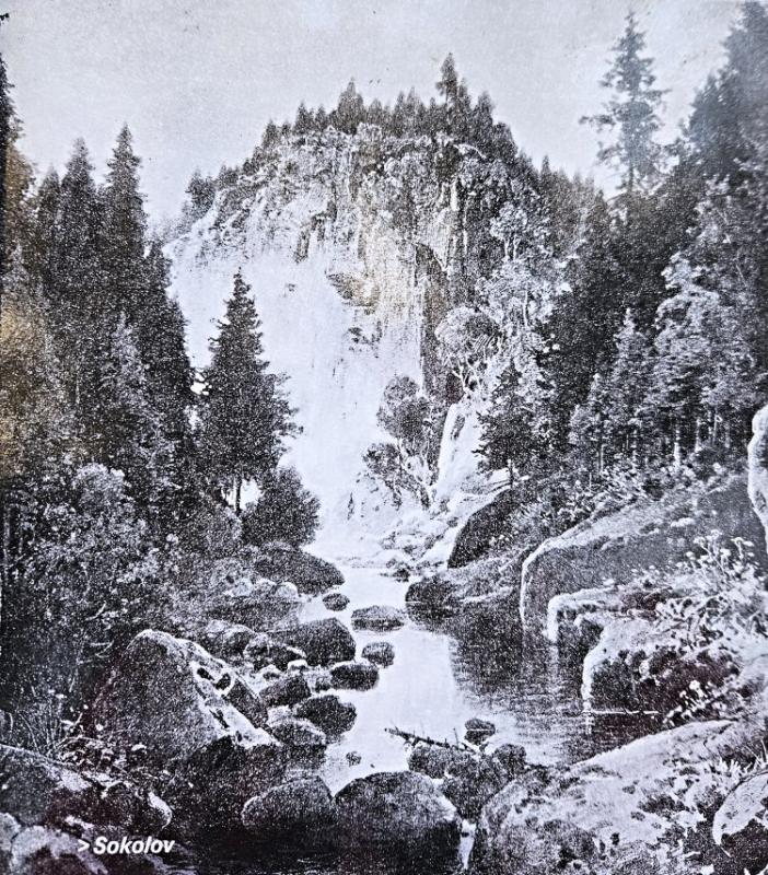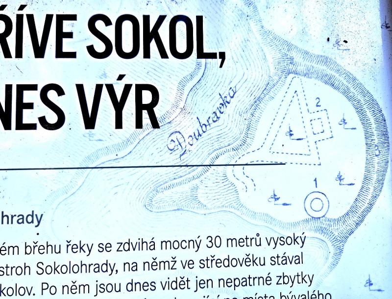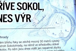 Historická kresba z poloviny 19. století od jjv., po proudu řeky Doubravy, na skalní masiv hradu Sokolov