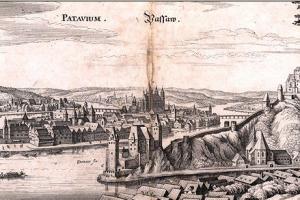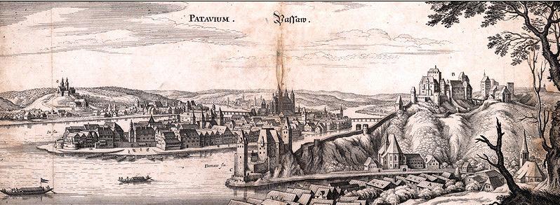 Dobové vyobrazení obou hradů a Pasova od východu.