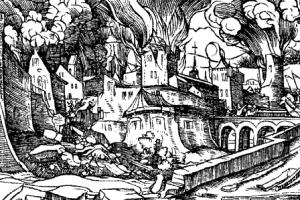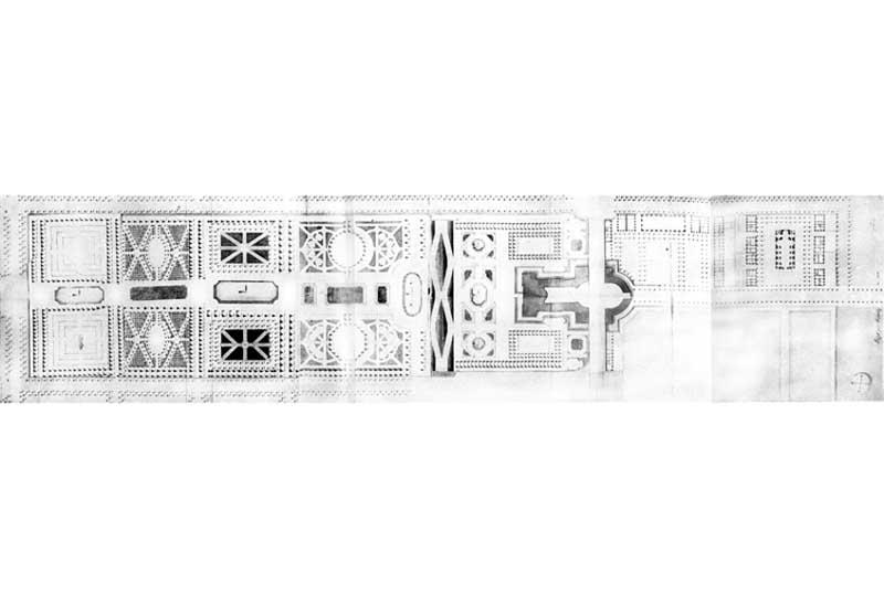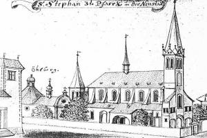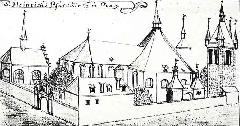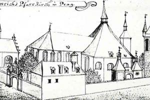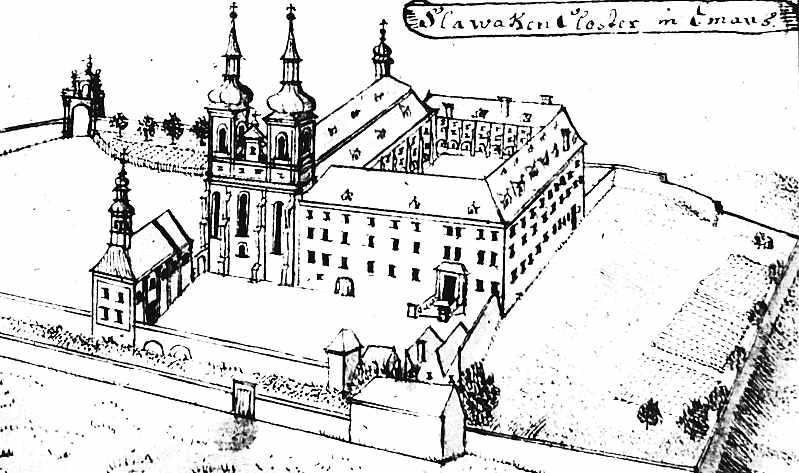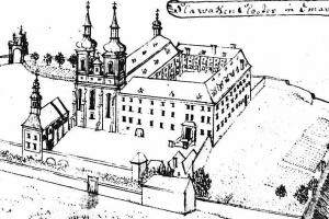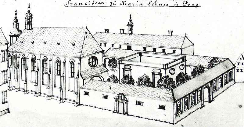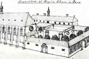 františkánský klášter s kostelem mají na kresbě chybné vzájemné proporce jednotlivých částí