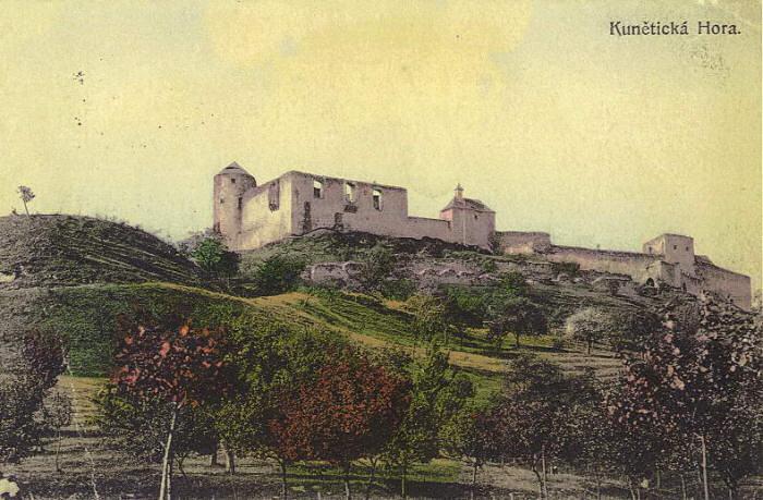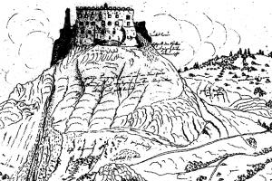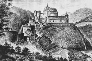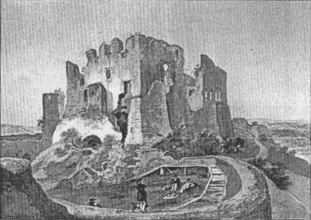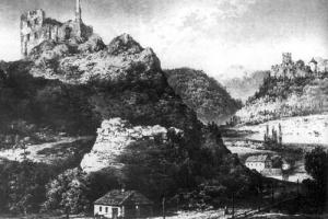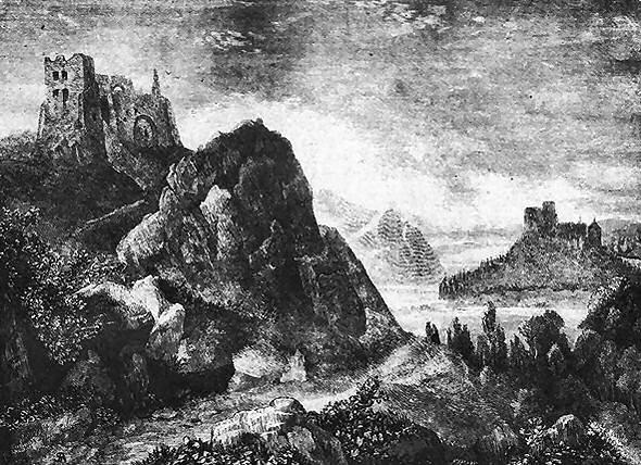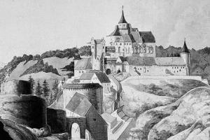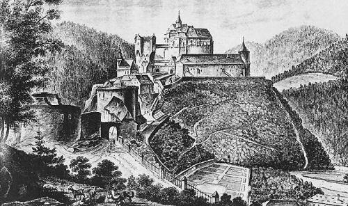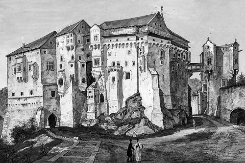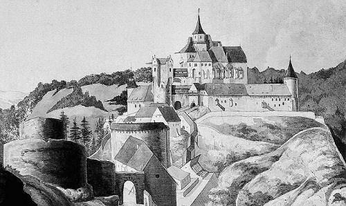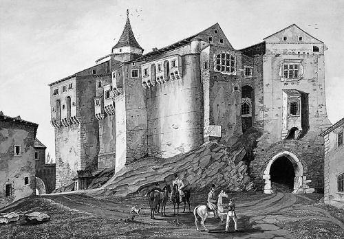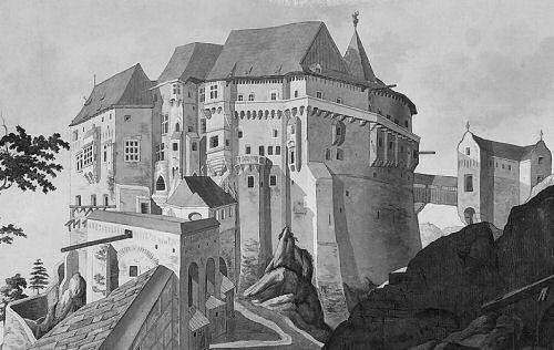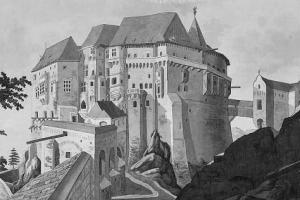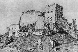 Jádro hradu od severovýchodu (kolorovaná kresba F. Richtera z roku 1833)