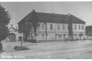 Původní podoba zámku na dobové pohlednici z r. 1905