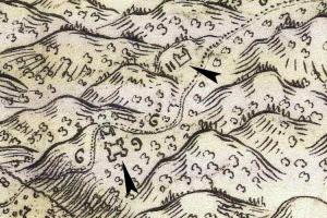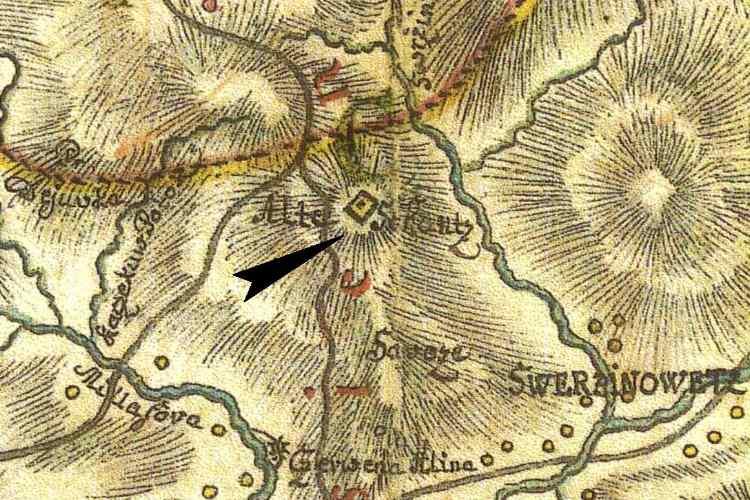 Alte šance a Velké šance v Mostech na mapě jablunkovského průsmyku z 18. století