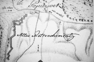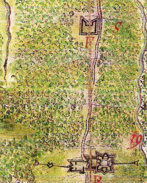 Pohled na opevnění zakreslené v mapovém listě č.67 I. vojenského (josefského) mapování z let 1764-68
