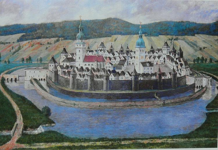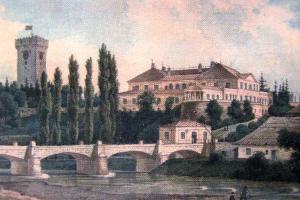Pohled na Zámeckou horu s hradní věží a komplexem zámku z nynějšího českého břehu