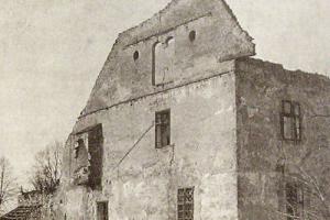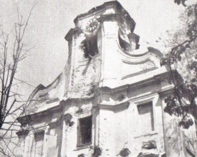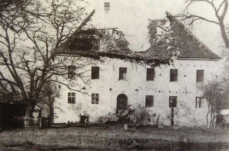 Pohled na to, co zbylo z kostela po bombardování 8.5.1945 při střetu rusů a němců v posledních minutách války