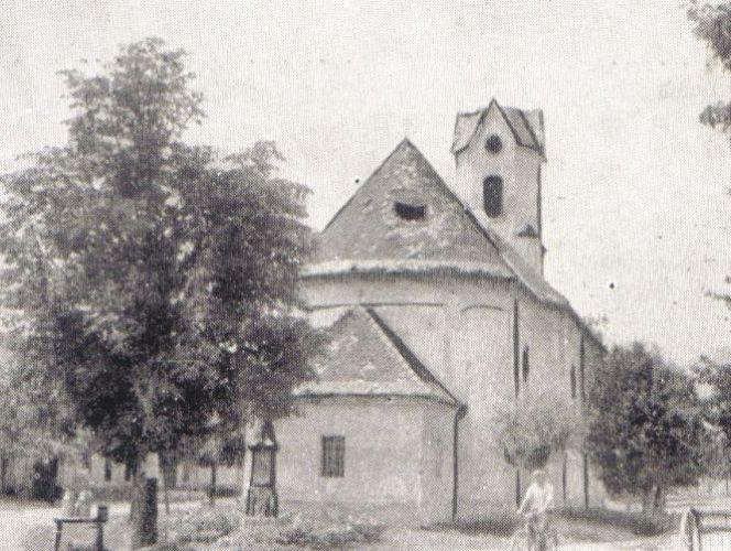 Čehovice - Fotografie z r.1945, kdy je vidět zásah do věže kostela, z knihy Prostějovsko za války z r.1948.