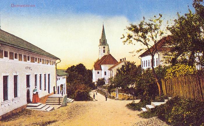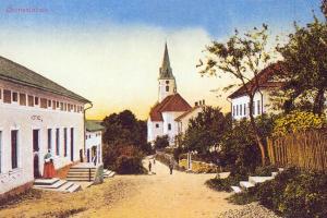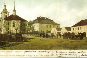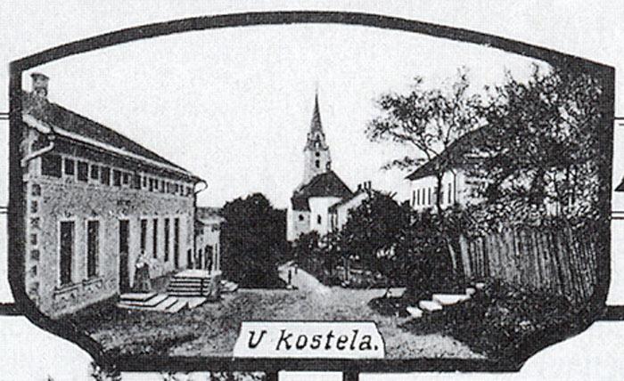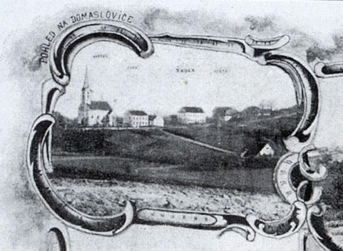 Výřez z pohlednice z roku 1902 (na pohlednici – kostel, fara, škola, pošta)