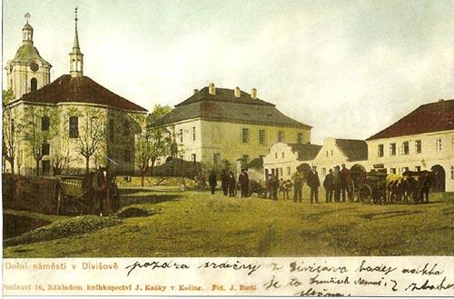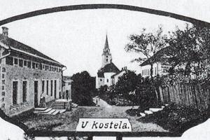 Kostel a fara v roce 1881 (v popředí snímku socha svatého Antonína, která v minulosti stála blíže zámeckému parku)