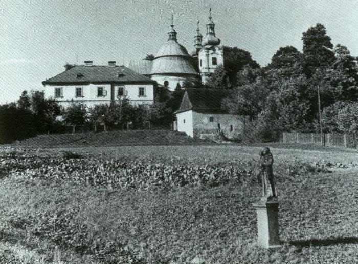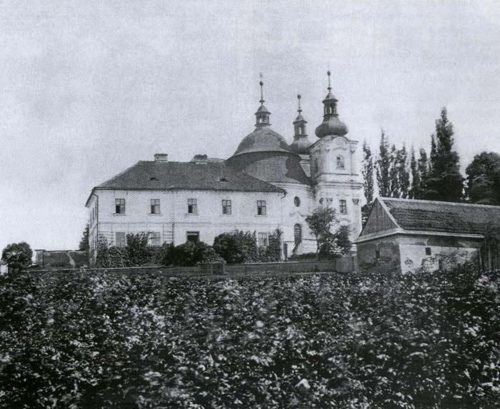 kostel se zámkem od jihu na historickém snímku (před r. 1910)