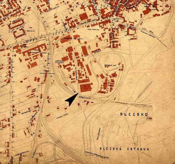 Výřez mapy Ostravy z roku 1928 (tzv. dvojhalí - označeno šipkou)