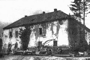 Fara a kostel Prozřetelnosti Boží před rokem 1881, pravděpodobně nejstarší dochovaná fotografie ze Šenova.