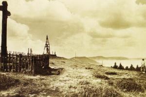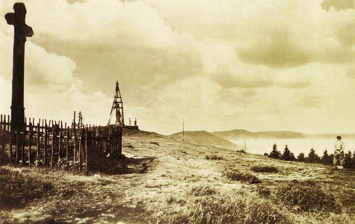 v popředí kříž a v pozadí měřická věž nad nejvyšším místem hory