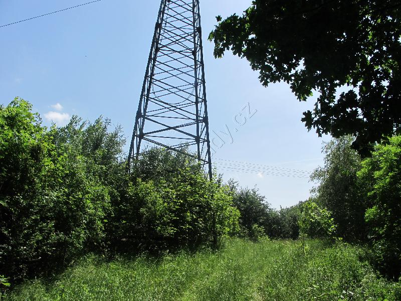 Celkový pohled od západu na výběžek kde stával hrad. Dnes tu stojí stožáry vysokého napětí..