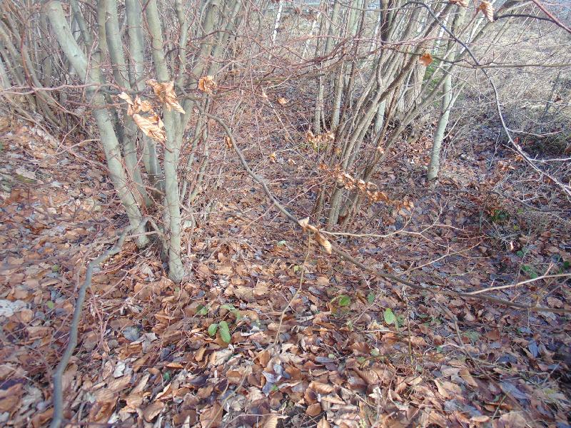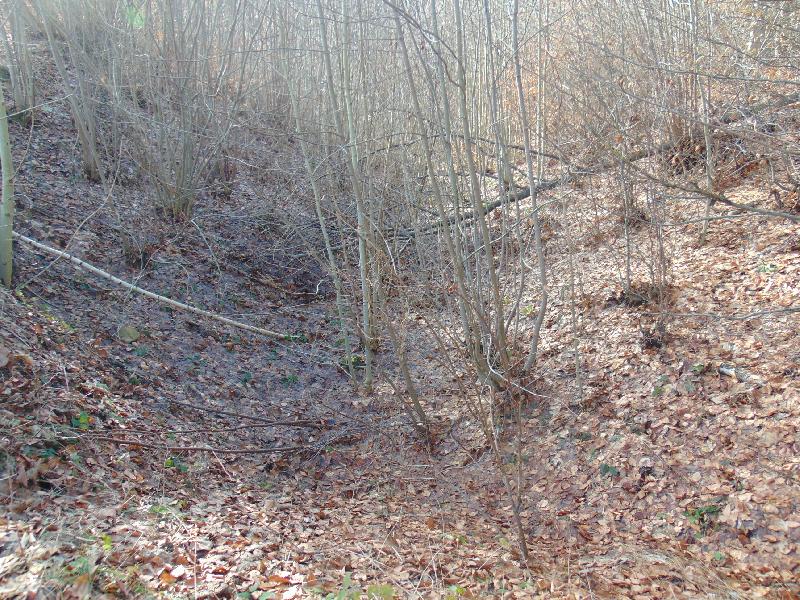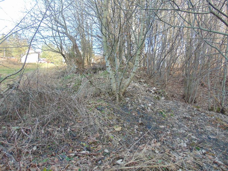 Zbytky druhého příkopu, dnes téměř zničené. Napravo val a za ním druhý příkop